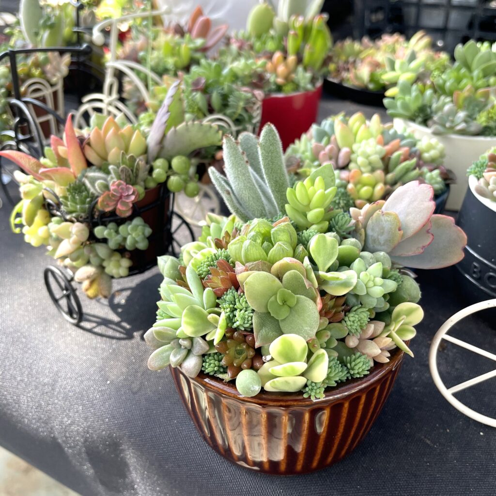 自分の好きな多肉植物を収穫し、固まる土を使って寄せ植えを作ります。